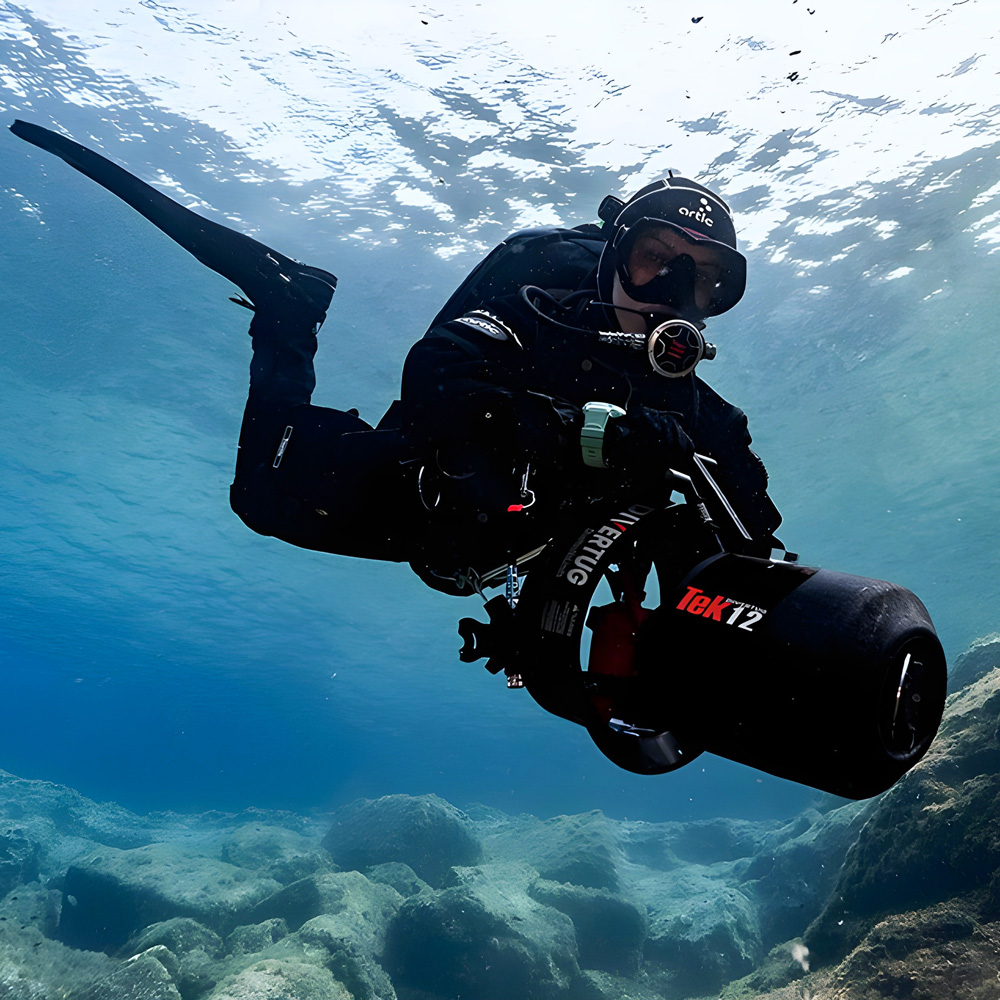 Der TEK12 eignet sich als erster technischer Unterwasserscooter und als Redundanz Gerät für komplexere Tauchgänge.