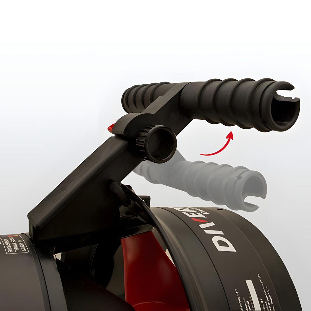 Der vordere Griff dient als Hauptkontaktpunkt während der Fahrt. Er lässt sich einklappen und macht den Unterwasserscooter kompakter für Transport und Boot. - Vorderer einklappbarer Tragegriff