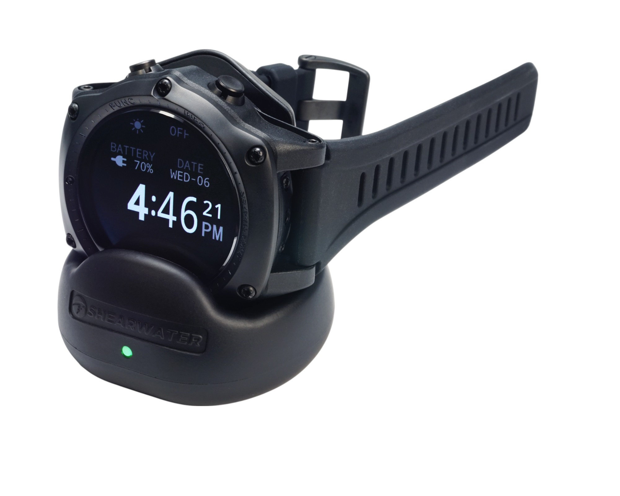 Technische Spezifikationen: Bildschirmauflösung: 400 x 400 | Anzeige Typ: Full-Color AMOLED | Anzeigen Größe: 3.53cm / 1.39” | Saphirfenster | Batterietyp: Intern wiederaufladbarer Li-Ion-Akku (fabrikmäßig austauschbar) | Batteriekapazität (ungefähr): 1.9 Wh | Akkulaufzeit: bis zu 30 Stunden (Tauchmodus), bis zu 50 Stunden (Uhrenmodus) | Drahtlose Ladestation | Anzahl der Gase: 5 OC / 5 CC | Tiefe: 200m / 660ft | Tauchprotokollkapazität (10 Sekunden-Rate): 500 Stunden